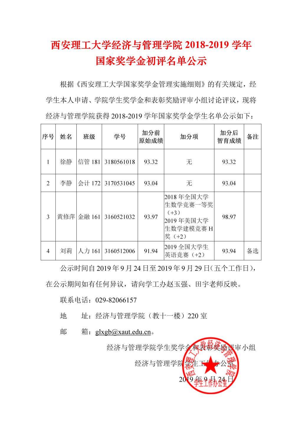 bevictor伟德2018-2019学年国家奖学金初评名单公示