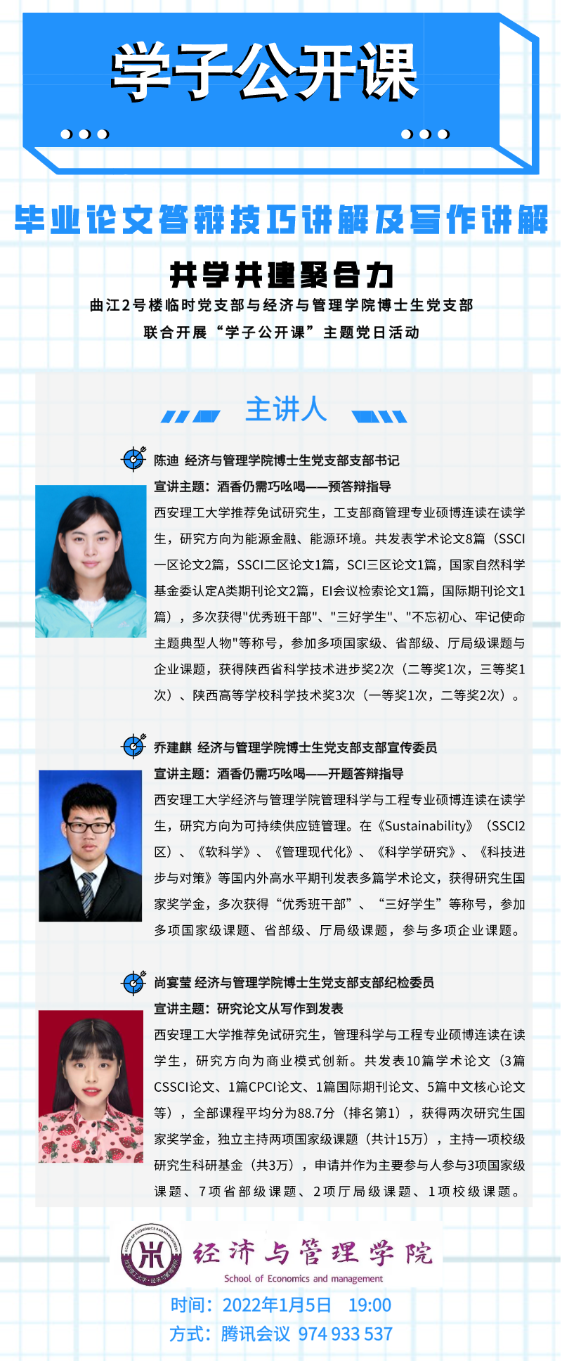 1月5日,bevictor伟德博士生党支部与2号楼临时党支部联合开展以“毕业论文答辩技巧与写作讲解”为主题的“学子公开课”线上主题党日活动,活动邀请到博士生党支部书记陈迪、纪检委员尚晏莹、宣传委员主讲乔建麒,2号楼临时党支部100余名党员线上参与,活动由院研会崔博文主持。