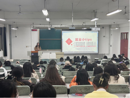 余佩媛就目前就业形势进行了详细分析,令毕业生充分认识到当前就业形势的严峻性与紧迫性;闫如玉就求职简历制作方面进行了详细的指导,包括简历中照片的修饰、文字的精炼以及量化数据的应用等;梁姝就常见求职面试类型进行了列举,对结构化面试、半结构化面试、无领导小组以及压力面试进行了介绍,并对面试过程中常常涉及的STAR法则、冰山模型进行了讲解;苏瑾则对全体同学进行了就业动员,她希望全体毕业生保持平和心态,综合考虑自身条件和社会需求,树立“先就业、再择业”的就业观,以平常心面对求职过程中遇到的挫折和困难,合理规划自己人生的道路。