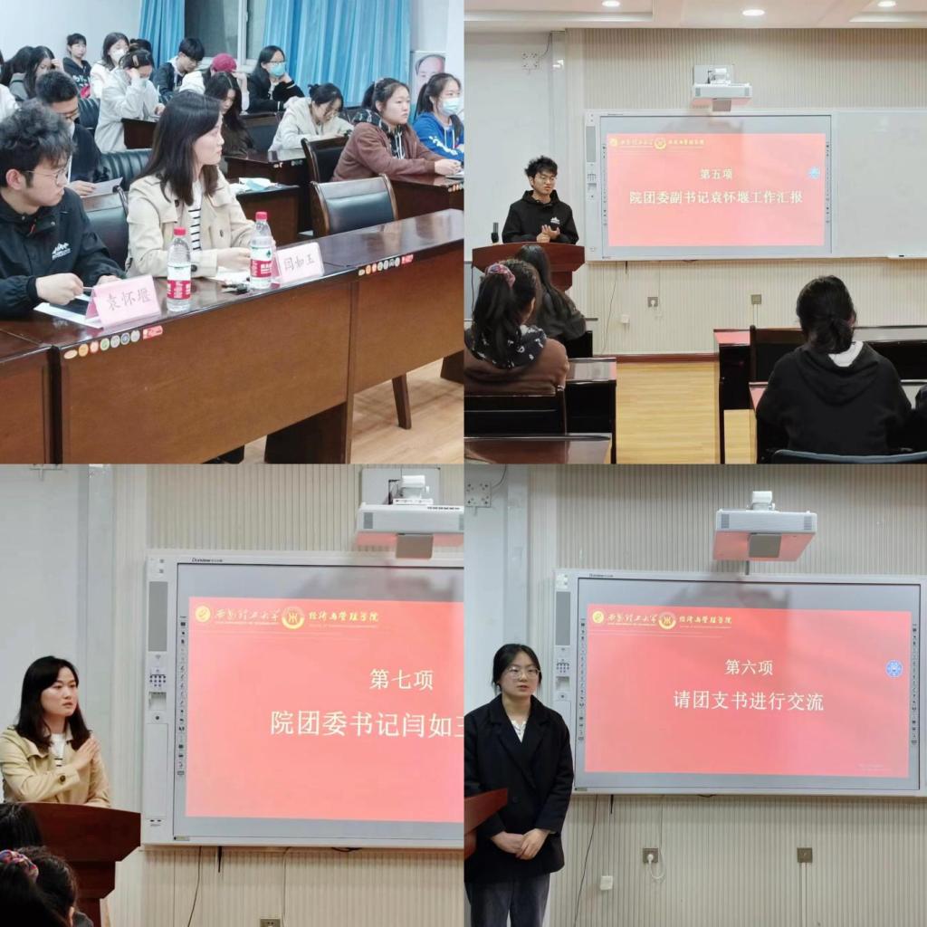 与会成员首先观看了习近平总书记十四届全国人大一次闭幕会习近平重要讲话。组织部负责人对团费缴纳、青年大学习、智慧团建的相关工作进行布置,袁怀堰就本学期工作计划和安排进行详细讲解。大会邀请部分团支书进行交流发言。闫如玉就近期工作做了总结,指出团支书的工作发展方向,对部分团支部的进步予以相应的表扬,她提出各团支部应团结支部成员,结合青年成长成才规律,分阶段、分需求、具有针对性的开展团组织建设工作,提升团支部凝聚力和向心力。