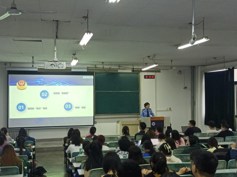 活动伊始,黄博琳老师简要介绍了牛祎警官,随后牛警官通过讲述真实的案例,生动形象地介绍了离谱的“枪决”短信、危险的“套路贷”、“刷单”陷阱三种常见类型的诈骗步骤和预防方法,她提醒同学们要牢记电信诈骗的十二句口诀,不要向陌生账户转账,不要点击不明链接,一旦发现被骗要第一时间报警,此外她建议同学们下载安装国家反诈中心APP,开通电话及短信拦截权限,更好地保护自己的财产安全。最后姚伟华老师对此次活动进行总结,他希望今后同学们能提升自身的金融安全防范意识与反诈意识,充分认识到诚实守信的必要性和重要性,树立正确的消费观与价值观。