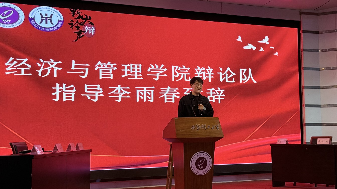 比赛结束后,辩论队指导李雨春总结发言。他首先对莅临老师、各院负责人表示欢迎,并对辩论的意义与价值进行了阐述。他讲到辩论不仅是一种语言表达的艺术,更是一种思维训练的方式,希望同学们通过今天的表演赛,感受辩论的魅力,培养批判性思维与逻辑分析能力。