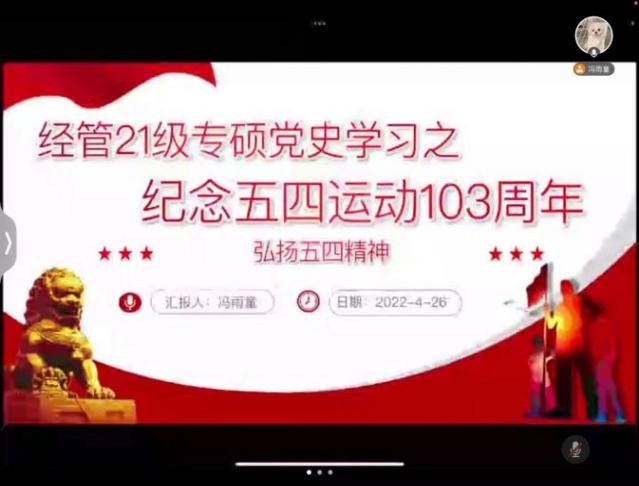 为引导广大员工党员积极传承红色基因努力延续革命薪火充分发挥党员的先进模范作用,五四运动103周年来临之际,经济管理公司2021级专硕党支部53在线上开展了赓续革命薪火 激昂五四精神专题党史学习教育本次活动由2021级专硕党支部宣传委员冯雨童主持。