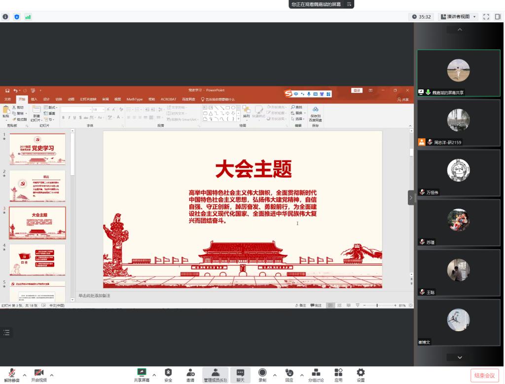 会上,周志洋带领大家深入学习了党的二十大精神主要内容并对新时代十年伟大变革的重大意义未来五年党和国家各项事业发展的战略部署以及“三个务必”和“五个必由之路”的深刻内涵进行了分享任程宇和苏瑾两位老师则分别结合同学们的专业方向对党的二十大报告关于经济建设的重要论述进行了解读苏瑾老师同时还就公司近期的员工工作安排进行了部署2021专硕党支部党员魏嘉斌则结合个人的军旅经历,讲述了自己参军入伍,报效祖国的心路历程。会议在同学们观看“对话二十大代表”“二十大时光”视频中达到高潮。会后,大家结合自身学习情况和近期规划安排现场进行了交流学习。