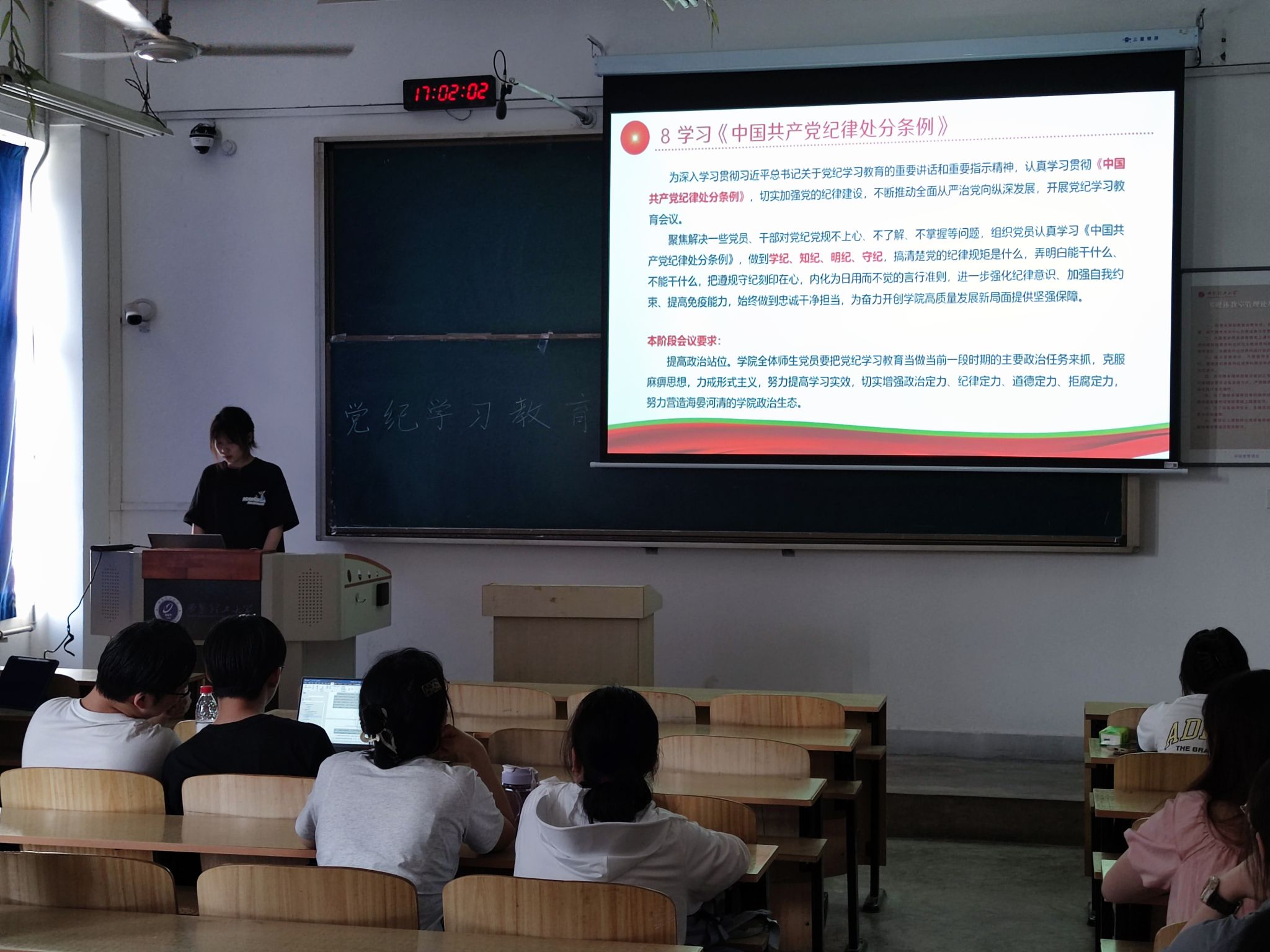 会上,梅依婷带领党员认真学习《条例》的总则与分则部分,并以组织观看微视频的形式帮助党员同志加深对于《条例》深刻内涵的学习与理解,她指出,全体党员应提高政治站位,把党纪学习教育当做当前一段时期的主要政治任务来抓,要端正学习态度,克服麻痹思想。最后,支部指导老师梁姝作大会总结,她强调,中共党员要端正思想、端正行为、端正态度,进一步强化纪律意识、加强自我约束、提高免疫能力,希望全体党员发挥先锋模范带头作用,不断提高自身的政治觉悟和道德水平。