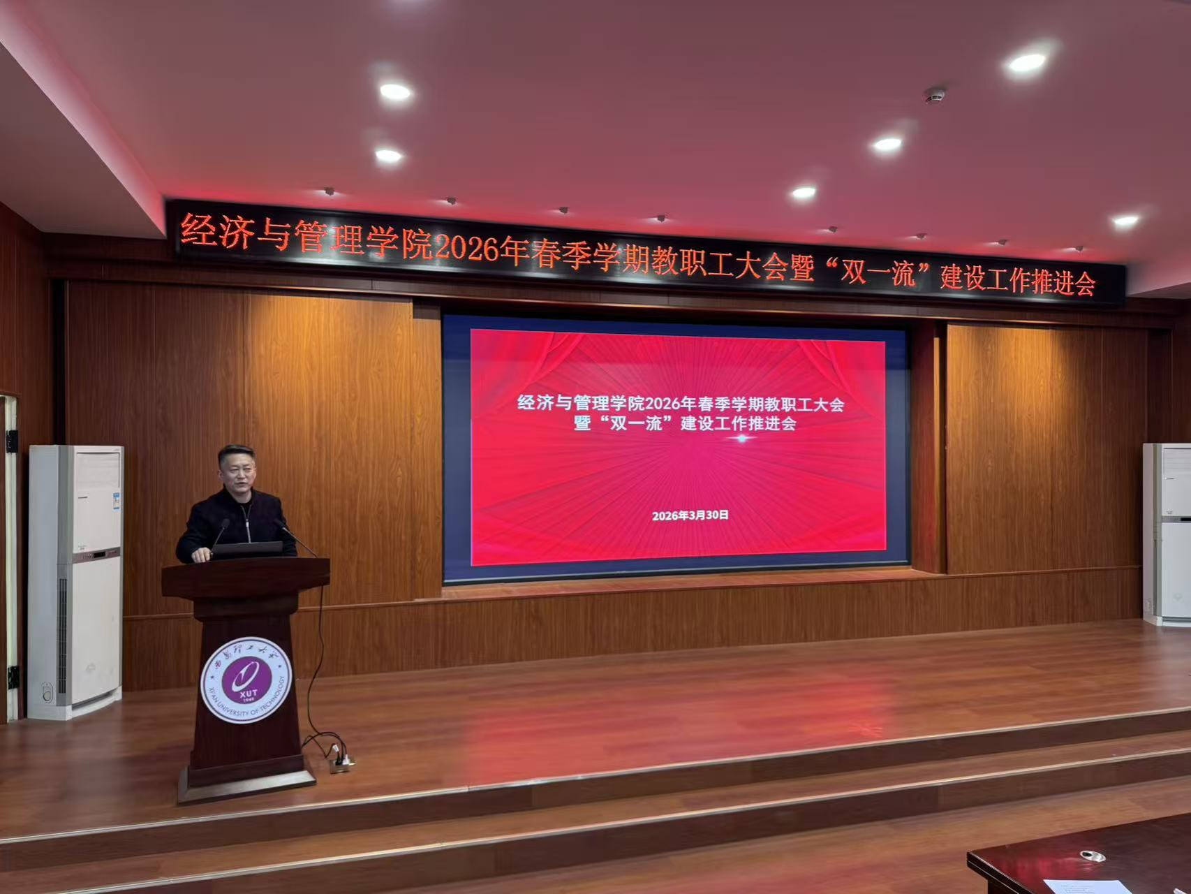 2026年3月30日下午,bevictor伟德在人文公司模拟法庭召开2026年春季学期教职工大会暨“双一流”建设工作推进会。公司领导班子成员及全体教职工参加会议,会议围绕贯彻落实中央和陕西省关于高等教育与就业工作的决策部署,系统总结阶段性成果,部署下一步重点任务。