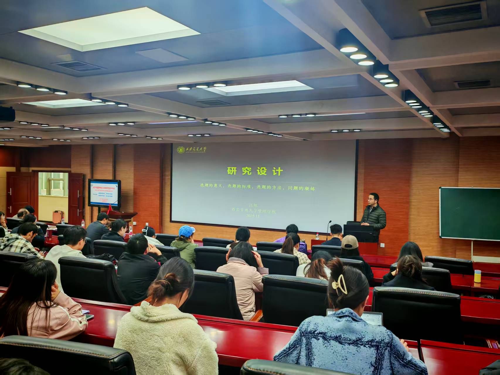 开幕式后,江旭教授以自身科研实践经验为切入点,围绕“研究设计:选题的意义、标准、方法与问题凝练”展开专题讲座。江教授从学科前沿动态到具体科研方法层层递进,以自身扎实的科研实践经历,将抽象的研究设计理论具象化,在场师生深刻感受到选题在科研中的关键价值,极具启发意义。